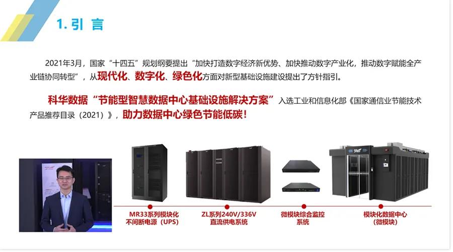 此外,在《通信业节能技术产品推荐目录(2021)》的发布会现场,科华数据数据中心产品总监林艺成分享我们在数据中心领域的相关科技研究成果。他指出,在双碳目标下,科华数据为节能型数据中心定制出一系列解决方案。科华数据入选的四款数据中心智慧节能产品,可有效降低数据中心PUE、减少数据中心供电损耗与污染、提升数据中心电源系统效率。